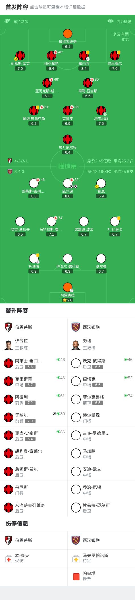 伯恩茅斯22西汉姆联,威尔逊双响,于纳尔扳平比分