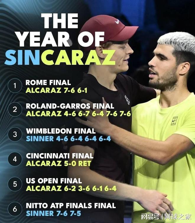 2025年都灵ATP年终总决赛最后的决赛,世界第一、西班牙全能战士阿尔卡拉斯,和世界第二、意大利新人王辛纳胜利会师,职业生涯第16次交锋,本赛季第六次决战紫禁之巅。两个一生之敌,年度最后一战,誓为各自美妙而又精彩的2025赛季,画上一个圆满的句号。