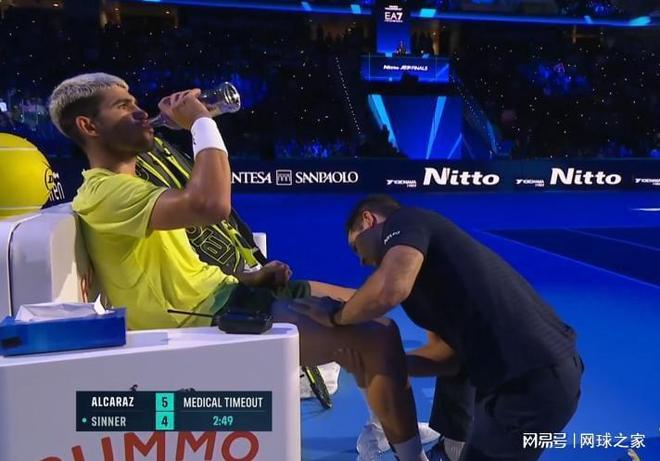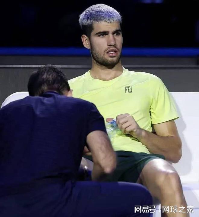 这场比赛第一盘第九局结束,率先发球的阿尔卡拉斯5:4领先,局间休息的时候,阿尔卡拉斯申请了医疗暂停,赛事防护员进场,为阿尔卡拉斯的右大腿进行了按摩。第一盘抢七告负之后,阿尔卡拉斯再次申请了医疗暂停,赛事防护员再次进场,为阿尔卡拉斯右大腿进行按摩,并缠上了厚厚的绷带。
