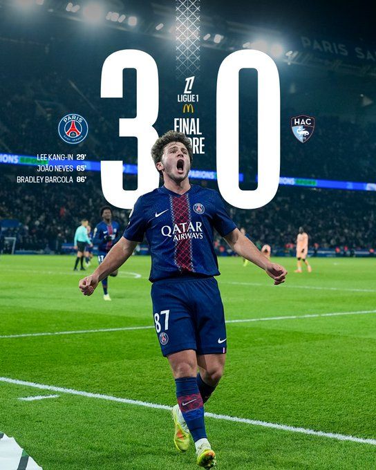 北京时间11月23日04:05,法甲联赛第13轮,巴黎圣日耳曼坐镇主场王子公园球场迎战勒阿弗尔。上半场,李刚仁破门,拉莫斯、姆巴耶失良机,舍瓦利耶门线神扑。易边再战,内维斯、巴尔科拉进球。最终巴黎3-0勒阿弗尔。积分榜方面,巴黎30分以2分优势领跑,勒阿弗尔14分第12。英超最新积分榜:曼城先赛输球落后榜首4分
