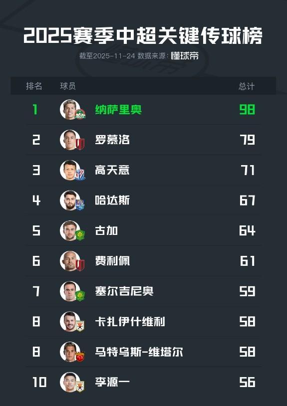 - 中超 | 2025中超关键传球榜:纳萨里奥居首,本土球员高天意最多