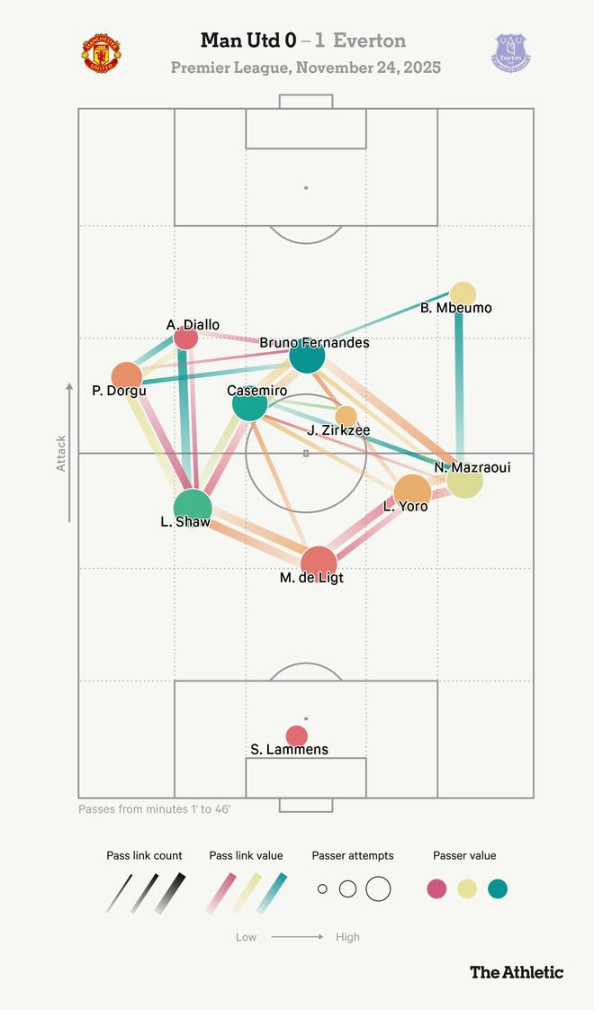 阿莫林的调整是否正确?中场休息时,阿莫林用梅森-芒特换下马兹拉维,并将阿马德从前腰位置调整到右翼卫。芒特立即融入比赛,他的射门被挡出,随后一次头球攻门也偏出。在姆伯莫低射考验了皮克福德之后,芒特还以一记弧线球射门险些得分。比赛未到60分钟,阿莫林用因伤错过对阵热刺比赛的梅努换下卡塞米罗,并派上迪奥戈-达洛特替下多古。曼联在比赛尾声阶段加强了压力,梅努为齐尔克泽送出传中,但后者在绝佳位置将头球顶偏。阿莫林将肖推到左翼卫位置以利用其传中能力,并用德利赫特与约罗进行了换位。德利赫特从右中卫位置前插,为齐尔克泽送出一记精妙传中,后者的头球被皮克福德托出横梁。曼联全场射门数以25比3领先埃弗顿,其中包括4次绝佳机会(埃弗顿为0次)。他们的预期进球总数为1.66,而埃弗顿为0.23。但是,他们在比赛大部分时间里,面对一支将近80分钟少一人作战的球队却显得步履维艰,最终导致了一场极具破坏性的失利。225天来首次首发的齐尔克泽表现如何?由于谢什科和马特乌斯-库尼亚缺阵,齐尔克泽担任了锋线箭头;库尼亚无法出战的消息是由阿尔特林查姆旅游局非常规地宣布的,原因是他周六未能如期出席该地的圣诞亮灯仪式。据了解,库尼亚是在训练中头部受伤,应该不会缺席太久。这是齐尔克泽自225天前(今年四月)对阵纽卡斯尔联以来首次首发,他看起来有些生疏。有一次停球失误,在中场深处丢失球权,随后还遭到了詹姆斯-塔尔科夫斯基的粗暴对待。起初,塔尔科夫斯基试图在无球状态下侵犯齐尔克泽以激怒他。这位荷兰人以必要的强硬予以回应,与这位埃弗顿后卫胸对胸顶牛。但随后塔尔科夫斯基又一次犯规却逃脱了惩罚。齐尔克泽逐渐进入比赛状态,在与姆伯莫完成一次漂亮的二过一配合后为多古创造机会,下半场他接卢克-肖的传中头球攻门,迫使皮克福德做出精彩扑救。齐尔克泽在空中战胜了基恩,将头球顶向远角,但皮克福德将球扑出。曼联锋线深度的不足,从下一顺位选择是谢伊-莱西可见一斑。莱西在青训学院表现令人印象深刻,或许会因其能力(尤其是他的左脚技术)在下个月的非洲杯期间进入一线队,但他年仅18岁,且从未代表成年队出场过。【上咪咕独家看英超】