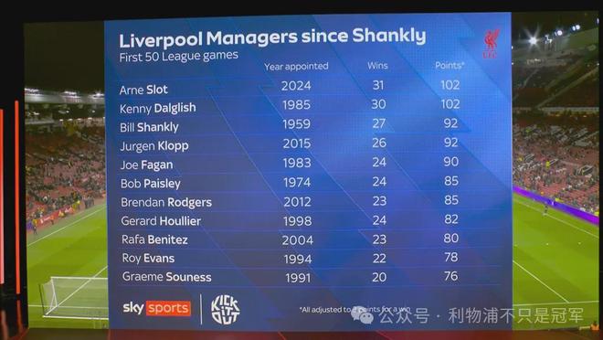 言归正传。部分利物浦球迷呼吁斯洛特下课的呼声风高浪急。昨夜天空体育的“周一足球夜(MNF)”节目中,卡拉格表示,他不会加入“Slot Out(呼吁斯洛特下课)”的阵营,但他批评了萨拉赫未能像范迪克那样站出来为球队发声。还原一下节目过程:主持人首先发问,利物浦到底怎么了?卡拉格说:“我不知道,没有人知道。连斯洛特都一直没有解决。”随后卡拉格话锋一转,开始批评萨拉赫:“对阵森林赛后,范迪克出来发声,这是他作为队长应该做的。在利物浦屡战屡败的情况下,一直是范迪克面对媒体发声。除了队长,利物浦更衣室也应该有其他球员站出来。”“一年前的这个周末,萨拉赫毫不避讳地对媒体讲述他个人的合同问题,说俱乐部没有为他开出续约合同。我只有在萨拉赫拿到全场最佳(会安排采访)或者需要新合同的时候,才看到过他出来说话。”“我希望看到作为球队领袖之一和俱乐部传奇的萨拉赫能够更多站出来为球队发声。”主持人追问卡拉格,从场上表现看到利物浦有哪些问题?卡拉格说“问题太多了可以说一整天”,他重点分析了利物浦球员的对抗问题,对曼城的第一个进球、对森林的三个进球,在对方进球前,利物浦都有太多应该赢下对抗的机会。随后主持人提出焦点问题:“有一些利物浦球迷开始想一件不可思议的事,这是上赛季刚拿到英超冠军的主帅,会第二个赛季就解雇他吗?”卡拉格:“不会,本赛季我从未有过这种想法。但我必须要说,在输给森林之后,我和一些球迷交流,他们的话让我有点震惊。”“斯洛特上赛季的成就让他得到了很大尊重,别忘了在斯洛特来之前,利物浦30年只拿过1个联赛冠军。”“第一个赛季就拿联赛冠军是非常特别的。但我的感觉是,人们对斯洛特没有对克洛普那样无条件的爱和支持。克洛普也有过一两次低谷,他曾遭遇英超主场6连败,但人们从来没有讨论过克洛普的帅位,像人们上周末讨论斯洛特帅位这样。”“但这就是足球,他执教的是世界最大俱乐部之一,目前成绩太糟糕了。但我认为,本赛季都没必要考虑和讨论斯洛特下课的问题。而这就是原因(手指大屏幕,见下图)。”
