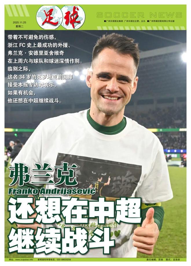 撰稿/左瑞带着不可避免的伤感,浙江FC史上最成功的外援弗兰克·安德里亚舍维奇在上周六与球队和球迷深情作别。临别之际,这名34岁的克罗地亚前国脚接受本报专访时表示,如果有机会,他还想在中超继续战斗。这是弗兰克最后一次身披绿色战袍、最后一次戴着队长袖标首发出战。初冬的杭州,迎来了中超最后一轮比赛,原本有一丝寒意的黄龙体育场,也染上了一缕温情。对于弗兰克来说,这一天迟早会到来,而且,他“已经有预感”。“毕竟,这个赛季我多数时间打替补,出场时间比前几年明显减少。”弗兰克说,这是他个人和俱乐部在彼此尊重、相互理解的基础上做出的共同决定,“这并没有让我感到特别消极或者悲伤,对双方来说,这是基于客观事实做出的决定。”对海牛的那场比赛,是弗兰克第140次,也是最后一次为浙江队出场,至此,他贡献了50个进球和26次助攻,帮助球队升级中超、闯进足协杯决赛、跻身亚冠正赛。真正道别的一刻,两种情绪复杂交织。“一是伤感,因为这是我代表球队的最后一场比赛;二是自豪,4年半的时间里,我做出了自己的贡献。”弗兰克说。即便是打替补的这个赛季,弗兰克也交出了11粒进球、5次助攻的出色成绩单。“我希望在有限的时间里,为浙江球迷展示最好的状态。”前两个赛季,他曾饱受伤病困扰,“今年俱乐部医疗团队的保障非常棒,让我能保持良好的身体状况和运动能力,而且我发现,内心的竞技之火还在燃烧。”弗兰克的告别战近乎完美,出场68分钟三次破门,尽管有两次被VAR判定无效,但依旧有一个漂亮的头球留在了这里。赛后,站在场地中央巨大的11号球衣前,弗兰克向全场超过2.8万名观众表示感谢,几度泪下,最后,他用中文领唱《月亮代表我的心》,全场随唱。最终,弗兰克转身,谢幕。2021年,俱乐部副总吴少堃前往克罗地亚,考察弗兰克。“那天我运气不错,为里耶卡打进了一个球,还有两个助攻。”弗兰克回忆说。到中国后正值疫情期间,他被隔离了三周,那段时间,总经理焦凤波和他多次面谈,俱乐部也给了他很多帮助。所以,效力浙江队的4个半赛季里,他彻底回报了这份信任,而且“没有任何遗憾”。尽管目前还没有明确去向,但弗兰克不想退役,也不想离开,而是希望留在中超。“我非常喜欢中国,对这里联赛的环境也非常熟悉。”他说虽然不想和C罗、莫德里奇这样的巨星比,但超过40岁继续踢球的球员并不罕见,何况,他完全感觉不到身体机能、竞技状态在下降。弗兰克始终坚信,浙江队具备足够的实力改变中超格局。“之前,我和焦总交流过,我希望我们每个赛季准备都更充分,而且,每个人都应该树立这样的雄心——每一场比赛、每一个赛季,我们都要争取更好的成绩和名次,甚至是冠军。”他说,只有带着这样的想法,球队才能更接近目标,“我们需要更强的自信应对更大的挑战。”本赛季,俱乐部大举推进年轻化战略,弗兰克身受冲击,但他并不郁闷,“球队现在的局面非常有趣。像我这个年龄的队员还在踢,年轻球员也成了主力。”他觉得,新人和老将具有互补性,在队里形成了一种非常好的平衡和氛围。“小伙子们的冲击力提升了球队的竞争性,对老球员是一种激励;而我们场上场下的经验,能让年轻球员受益,为他们的成长带来极大的帮助。”2026年,浙江队会继续年轻化,小伙子们必然会成为球队核心和主力,但弗兰克认为,有些目标不可能一蹴而就,俱乐部和外界都要给年轻球员足够的时间和宽容。以正在更新换代的克罗地亚队为例,40岁的莫德里奇和23岁的格瓦迪奥尔,很可能在明年世界杯完成球队领袖的权力交接,但后者其实成名已久,在曼城和克罗地亚队已得到足够的历练。“所以,格瓦迪奥尔会是明年世界杯上我最期待的球员。”弗兰克的这一观点对“魔笛”没有任何不敬,相反,他非常钦佩这位同胞,也同样尊重客观规律。克罗地亚独立34年来,谁是足坛的二三号人物?这个问题或许会有争论,但在他心里,“以足球方面的才能和对国家队的贡献来讲,莫德里奇是当然的NO.1,毫无争议。”一个人口不足400万的国家,却在世界杯屡创佳绩,其原因弗兰克理解为克罗地亚人骨子里的战斗精神。“我们就是这样的一个民族,无论对手实力多强,名气多大,未分胜负前我们无所畏惧。当然,比赛打完后,我们会给对手足够的尊重。”弗兰克自己也具备同样的民族特质和战斗精神,这也是他在浙江深受球迷喜爱,备受球队器重的原因之一。本赛季,浙江队创下中超补时阶段进球最高纪录,球队气质和作风也正在发生积极转变。在这一点上,从2021中甲赛季就以身作则的队长起到了积极作用。在弗兰克看来,要想提高一家俱乐部或者一支国家队的竞技水平,一方面是对足球的理解需要提高,另一方面就是足球从业者们要敢于克服困难、突破极限,要有不断挑战自己的信心。“要培养优秀的球员,尤其是世界级球员,不仅需要个人持续的自我激励,还需要强化团队愈挫愈勇的精神属性。”父亲斯捷潘是克罗地亚1992年加入国际足联后的第一代国脚,哥哥帕捷罗几年前才结束职业生涯,弗兰克自己也曾身披“格子军团”球衣而战。作为同行,父亲和兄长非常理解他又一次处于人生的十字路口,也很关心他的下一站会在哪里。但三个孩子完全不能理解,他们的爸爸为什么要离开这个繁华美丽的中国城市?无论是9岁的大女儿芭芭拉,还是更小的两个儿子戴