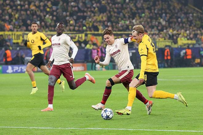 比赛中。图源:视觉中国第58分钟,阿德耶米的进球,帮助多特蒙德3比0比利亚雷亚尔,全场补时阶段,格罗斯传中,斯文松头球破门,最终多特蒙德4比0完胜比利亚雷亚尔。