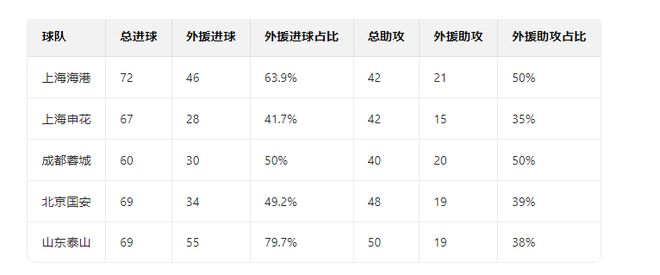 通过数据来看,中超前五强球队的外援依赖度排名由高到低就是:山东泰山、上海海港、成都蓉城、北京国安、上海申花