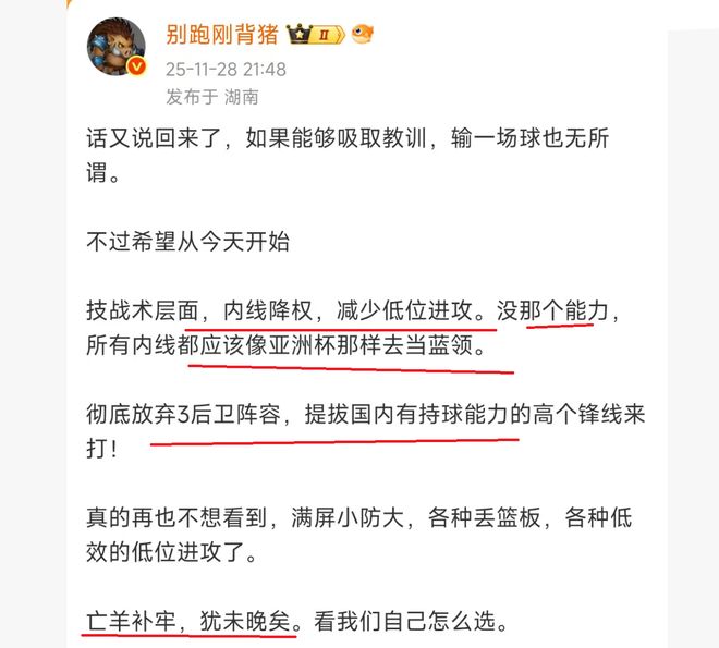 还有一个就是郭士强在用人方面,出现了巨大的问题,喜欢用三后卫战术,用后卫去防守对方的锋线球员,结果,以小防大,被对手一次又一次在头上投进三分球,十分尴尬。同时,由于场上球员的身高不够,也导致不断丢掉篮板球。原本中国男篮球员有身高优势,然而,郭士强却放弃了自己的优势,显然这样做法,就是自废武功。因此,“别跑刚背猪”建议郭士强,要彻底放弃3后卫阵容,提拔国内有持球能力的高个锋线来打!正所谓,亡羊补牢,犹未晚矣。那么,接下来就看郭士强会做出什么样的选择了。