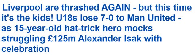 利物浦青年队则只排在第9位。他们对惨败并不陌生,他们的U16梯队曾3-14大败于阿森纳脚下,目前效力曼联的17岁丹麦中锋奇多·奥比单场打入10球一战成名。