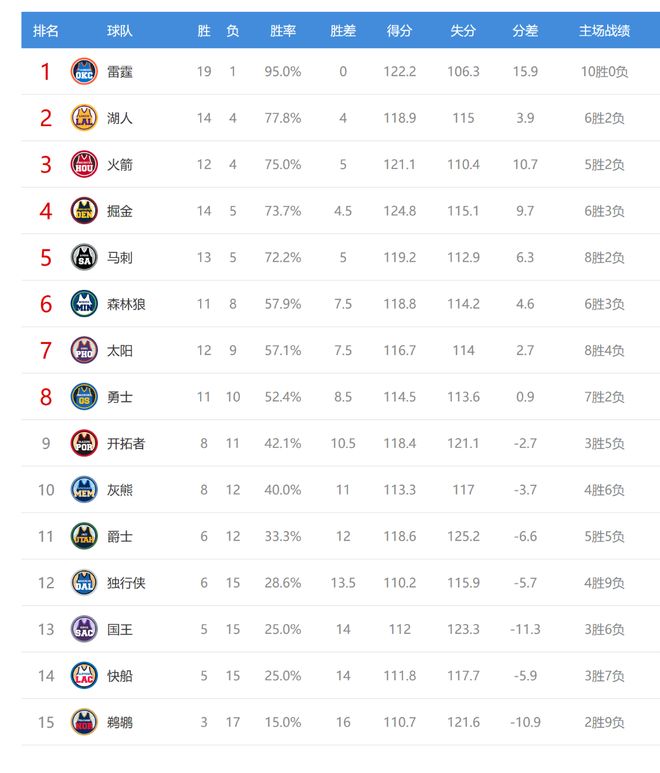 勇士赢球后11胜10负,继续排名西部第八。鹈鹕输球后3胜17负,继续排名西部垫底。今日比赛后掘金、马刺排名互换,太阳、森林狼排名互换,快船、独行侠排名互换。其他西部球队排名不变。