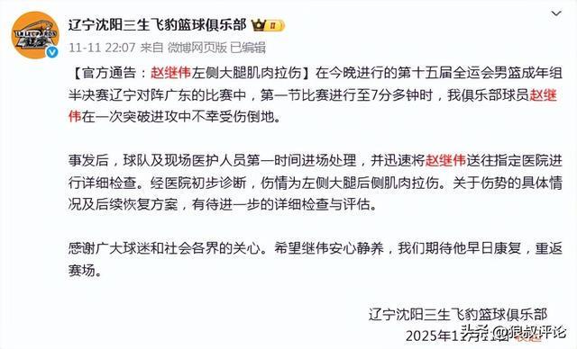 根据辽宁男篮官方的公示,在今晚进行的第十五届全运会男篮成年组半决赛辽宁对阵广东的比赛中,第一节比赛进行至7分多钟时,我俱乐部球员赵继伟在一次突破进攻中不幸受伤倒地。事发后,球队及现场医护人员第一时间进场处理,并迅速将赵继伟送往指定医院进行详细检查。经医院初步诊断,伤情为左侧大腿后侧肌肉拉伤。关于伤势的具体情况及后续恢复方案,有待进一步的详细检查与评估。