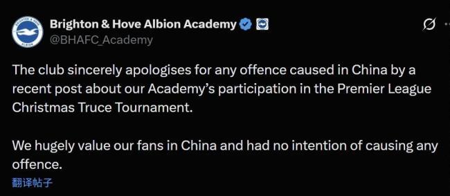 11月29日,就“三笘薰持‘日本最后兵’照片合影事件”,英超布莱顿队青训学院的官方社交媒体账号向中国致歉称:“我们极为珍视中国球迷,绝非有意冒犯。” 声明称,布莱顿俱乐部就近期一则关于青训学院参加英超圣诞休战活动的帖子在中国造成的任何冒犯致以诚挚的歉意。