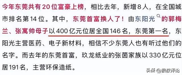 北京时间12月1日,根据广东媒体的报道, WCBA新赛季揭幕战,广东女篮以88-73击败江苏女篮。广东女篮举行了上赛季总冠军戒指的颁发仪式。因广东女篮夺得上赛季WCBA总冠军,球队新赞助商东阳光奖励她们200万元作为鼓励。广东东阳光作为东莞当地的龙头企业之一,分别赞助了广东男篮和广东女篮,200万的夺冠奖金,确实是体现出“有钱任性”的操作思路。要知道,女篮联赛的球队,实际上远远无法与男篮相提并论,但作为加入的赞助商,奖励200万作为夺冠奖金,确实是体现出有钱任性的土豪气质。今年10月底,2025年胡润百富榜,农夫山泉创始人钟睒睒、字节跳动创始人张一鸣、腾讯创始人马化腾分列前三。今年东莞共有20位富豪上榜,相比去年,新增8人,在全国城市排名第14位。其中,东莞首富换人了!由东阳光的郭梅兰、张寓帅母子以400亿元位居全国146名,东莞第一名。