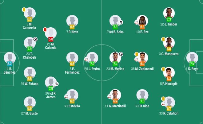 【出场阵容】切尔西首发:1-桑切斯、27-古斯托、29-福法纳、23-查洛巴、3-库库雷利亚、24-詹姆斯、25-凯塞多、41-埃斯特旺(46'49-加纳乔)、8-恩佐、7-内托、20-佩德罗(55'9-德拉普)替补未出场:12-约恩森、34-阿奇姆彭、4-阿达拉比奥约、5-巴迪亚希勒、17-桑托斯、10-帕尔默、11-吉滕斯阿森纳首发:1-拉亚、12-廷贝尔、3-莫斯克拉、5-因卡皮耶、33-卡拉菲奥里(46'49-斯凯利)、36-苏比门迪(67'8-厄德高)、41-赖斯、10-埃泽(72'14-哲凯赖什)、7-萨卡、11-马丁内利(67'20-马杜埃凯)、23-梅里诺替补未出场:13-凯帕、4-本-怀特、16-诺尔高、22-恩瓦内里、9-热苏斯