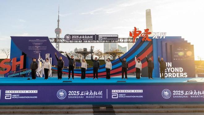 11月30日上午,2025上海马拉松在申城如期启幕。上海市市长龚正点亮2025上海马拉松路赛道,并与世界马拉松大满贯联盟首席执行官道内·斯通、上海市副市长解冬等中外嘉宾一道,为比赛鸣枪发令。