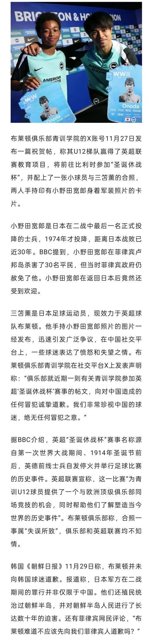 据英国广播公司(BBC)11月29日报道,英超布莱顿俱乐部当天就其社交媒体上一张引发争议的图片道歉,图中,日本国脚三笘薰与一名小球员各自手持一张印有二战时日本军官小野田宽郎头像的卡片。