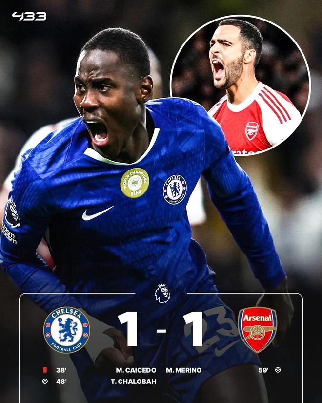 随后第58分钟,梅里诺同样用一记头球扳平比分,两队重回同一起跑线。不过,多打一人的枪手并未能发挥人数上的优势,最终,客场1-1战平切尔西。