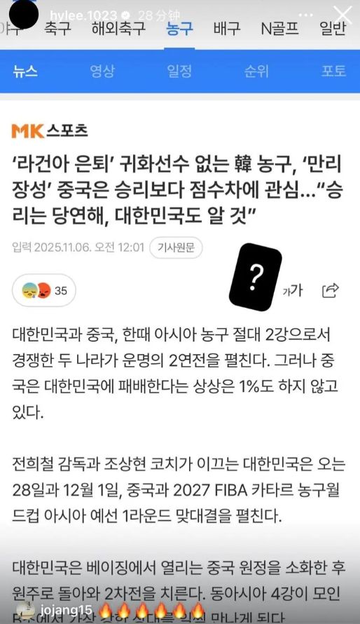 在主场大胜中国男篮后,韩国队的前锋李贤重转发了此前韩国媒体写的,韩国队很难击败中国男篮的新闻,似乎早就憋了一口气。李贤重之前基本上没有更新过自己的社交媒体,但是在击败中国男篮后,他立马将之前韩国媒体报道的,韩国队很难战胜中国男篮的新闻截图上传,还打上了一个大大的问号。