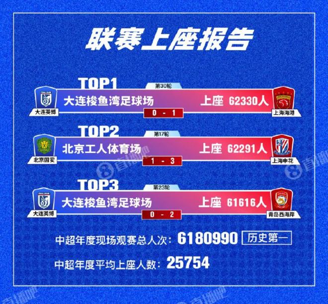 本赛季中超联赛的总现场观众高达6180990人次,首次突破600万大关,刷新了历史纪录。大连英博主场与上海海港的收官战上座人数达到了62330,创下了赛季之最。整个赛季,一共12场比赛上座人数跨过了6万人大关。中超联赛依旧有着十足的吸引力,这是其球市火爆的根本原因。经过了职业联赛三十年的培育,各支中超球队都拥有了数量众多的拥趸,而且周末看球已经潜移默化成为了很多球迷的生活方式之一。在中足联正式挂牌之后,中超联赛精彩程度也在逐步提升。本赛季上海海港、上海申花、成都蓉城和北京国安四强争霸的戏码敛足眼球,保级大战也扣人心弦。王钰栋、刘诚宇、蒯纪闻等青年才俊逐渐崭露头角,也提升了联赛的吸引力。中足联通过与各赛区安保部门沟通协调,竭尽所能帮助赛区实现上座人数的扩容。再加上《关于支持国际消费中心城市培育建设的若干措施》等政策指出,在确保安全的前提下,提高营业性演出、体育比赛等大型群众性活动的可售(发)票比例。这些都成为了中超联赛球市火爆的先决条件。上述种种,让中超联赛球市的火爆摆脱了“偶发性”,逐渐走向常态化。中足联也适时启动了“职业联赛文明行动月”系列活动,引导球迷文明、有序观赛。中超联赛火爆、健康的球市,进一步提升了中超联赛的品牌形象和商业价值。