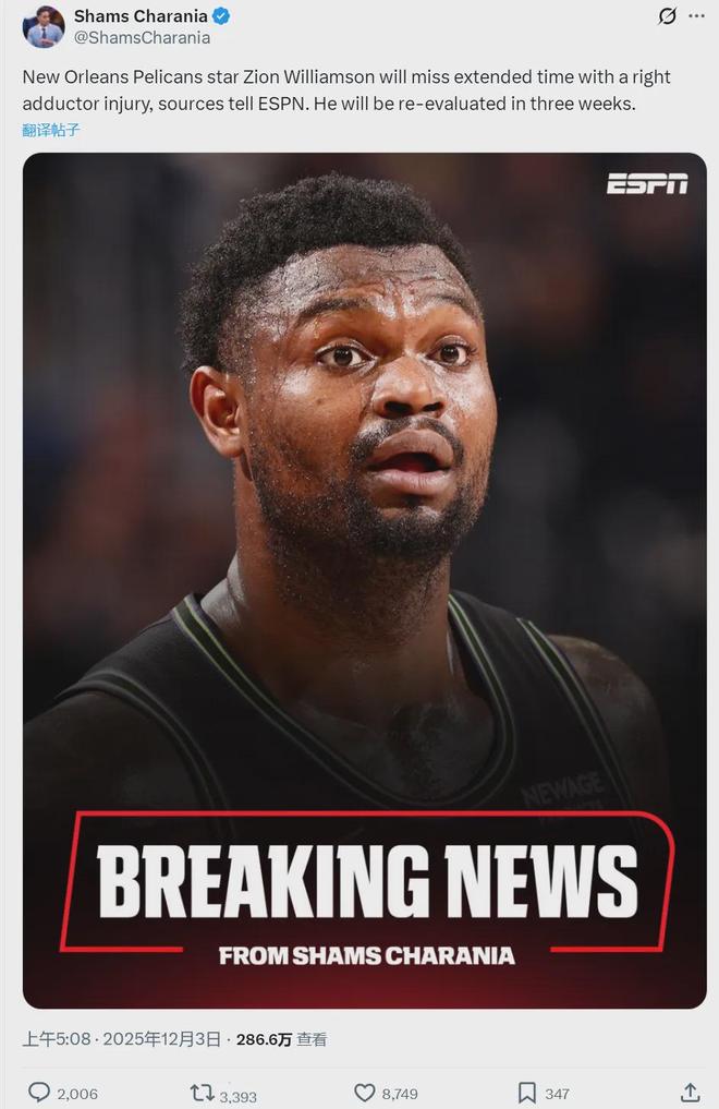 北京时间12月3日,据NBA名记Shams报道,鹈鹕球员锡安遭遇右内收肌拉伤,将在3周后接受复查。没错,锡安又双叒伤了。本赛季常规赛只打了21场左右,锡安已经遭遇三种伤病:左脚骨挫伤、左腿筋一级拉伤、右内收肌拉伤。