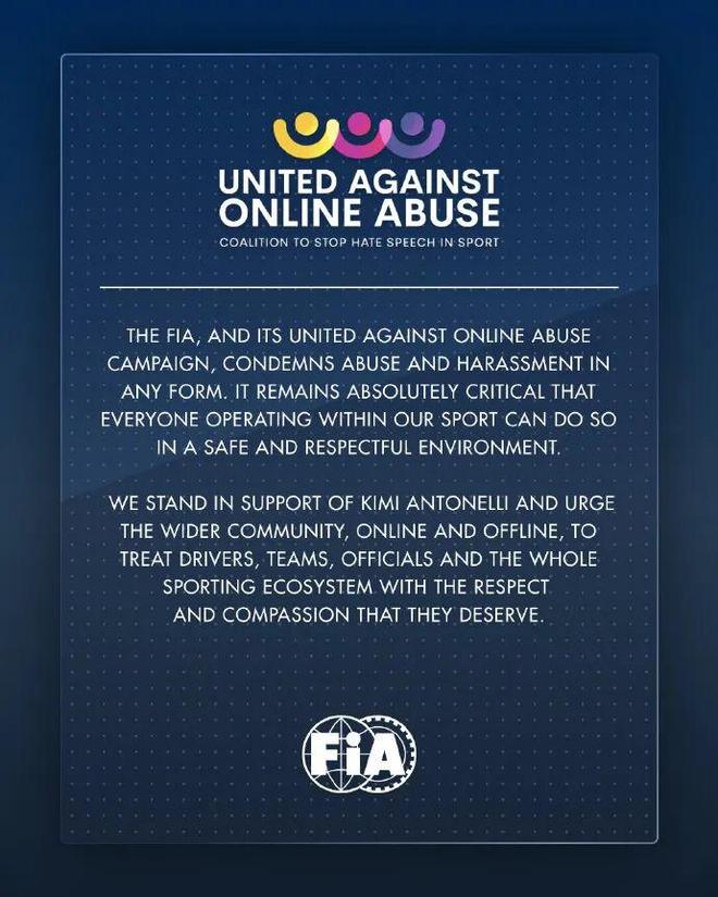 国际汽联也发表声明,明确表示“谴责任何形式的辱骂和骚扰”,并强调“最重要的是,每位在我们这项运动中工作的人都能够在安全、尊重的环境中工作。”