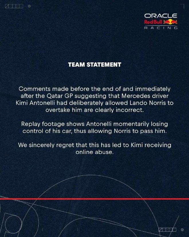 赛后,红牛车队顾问马尔科公开指责安东内利故意“挥手放行”诺里斯。他告诉记者,诺里斯被让车“如此明显”。红牛车手维斯塔潘的赛道工程师兰比亚塞也在车队无线电中表达了类似观点:“我不确定安东内利那里发生了什么,看起来他就像直接靠边让诺里斯过去了。”