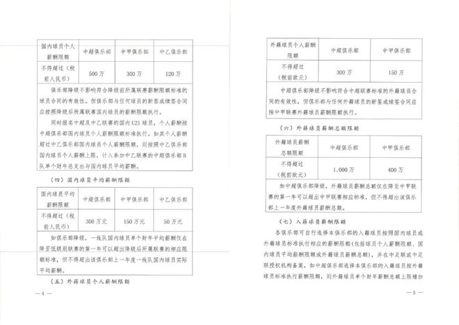 记者陈永报道12月3日,中足联发布了中国足球职业联赛及职业俱乐部一系列新规。四份文件分别是《中国足球职业联赛俱乐部财务约定指标》《中国足球职业联赛参赛资格递补原则及办法》《中国足球职业联赛俱乐部变更注册协会及股权转让规定》《中国足球职业联赛俱乐部准入规程》。和过往与准入相关的条规相比,今年四大文件包含的内容延续性较强,但亦有一些细致的变化,其中梯队参赛标准有可能带来隐忧。财务约定指标中包含俱乐部支出限额、一线队薪资限额、奖金限额等,其中一线队薪资限额又包含国内球员个人薪酬限额(含港澳台)、国内球员平均薪酬限额、外籍球员个人薪酬限额、外籍球员薪酬总限额、入籍球员薪酬限额等指标。总体上各项指标延续性较强,值得留意的变化在于:其一,入籍球员个人薪酬限额如果执行外籍球员个人薪酬限额标准,则外籍球员个人薪酬限额增加200万欧元(税前,下同)到1200欧元(中甲增加80万欧元到480万欧元),但外援本身的薪酬限额仍旧是1000万欧元和400万欧元;其二,同时参加中超和中乙的俱乐部(即拥有中超B队的俱乐部),需同时满足俱乐部总支出不超过中超总支出限额要求、参加中乙联赛的B队总支出不超过中乙总支出限额要求;其三,同时报名中超及中乙联赛的国内U21球员,个人薪酬按中超俱乐部国内球员个人薪酬限额标准执行,如其个人薪酬超过中乙俱乐部国内球员个人薪酬限额,则按照中乙俱乐部国内球员个人薪酬上限,计入参加中乙联赛的中超俱乐部B队单个财年总支出与国内球员平均薪酬。参赛资格递补延续性也较强,细化了中乙联赛的递补方案,因为涉及U21联赛球队,除了相应的递补顺序之外,中冠及U21球队的递补顺序为:附加赛负者、中冠第五名、U21联赛第二名、中冠第六到八名。变更注册协会及股权转让,取消了“转入地地级市(含)以上人民政府出具同意函”,此外重要股权转让程序可在赛季中进行一次。队伍建设方面,有关梯队的标准由此前的“654”(中超U21、U19、U17、U15、U14和U13,中甲不设U21,中乙不设U21和U19)变更为“543”(俱乐部根据自身发展规划自行确定青少年梯队年龄层次)。不过,中超梯队至少要有3支梯队(其中必须包含13到15岁一支,16到21岁一支,另一支自行选择)、中甲至少2支梯队(13到15岁一支,16到21岁一支)、中乙至少1支梯队(13到21岁一支)的球员注册单位为本俱乐部,而非其他俱乐部或法人,且应参加足协或中足联举办的官方赛事(含资格赛)。在梯队标准方面,中足联进行了减负。目前的各项标准及准入规程,和当前中国职业联赛的现实息息相关,不过,针对个别细节,各方也有所建议。比如财务约定指标,有观点认为不需要设定过细的个人薪酬标准,而是设立总薪酬标准,由俱乐部根据自身情况灵活调整,如此俱乐部可以引进更高级别的外援,或者给更优秀的本土球员更多的薪资。有关这一点,在俱乐部财务情况逐步稳定之后,其实是可以考虑的。而关于俱乐部梯队,新的标准其实存在一丝隐忧。新的梯队标准是“543”,但参赛标准是“321”,其中中超的标准是必须包含13到15岁一支,16到21岁一支,另一支自行选择;中甲是13到15岁一支,16到21岁一支;中乙则是13岁到21岁一支。如果按照这个标准,即将建设的中国顶级青训联赛(18岁及以上),理论上可能缺失参赛队,因为中超俱乐部也可以只把梯队建设到17岁,尤其是2026赛季,少则4支多则5支中超B队还要参加中乙联赛的背景下。建议更加合理的方案是抓大放小:中超俱乐部必须拥有1支18岁及以上的球队参加顶级青训联赛(如U21联赛和U19中青赛合并之后的主客场U20联赛),同时必须参加U17赛事和U15赛事;中甲俱乐部必须参加U17赛事和U15赛事;中乙俱乐部必须参加U15赛事。编辑 | 尼诺 图片 | IC Photo、中足联