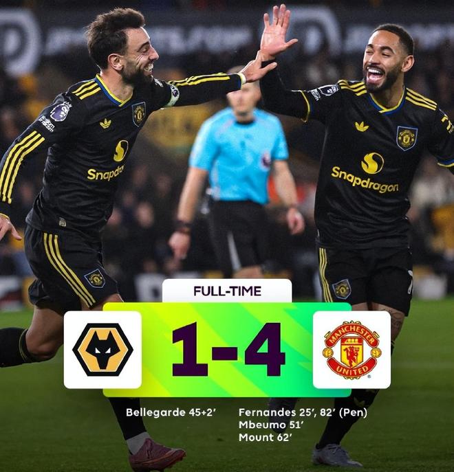 英超第15轮曼联4比1狼队的确是很提气的一战,在阿森纳爆冷失分,利物浦更衣室内乱的当下,红魔可以3轮不败升至积分榜第六位的确不俗。不过圣诞魔鬼赛程还将考验球队的应对能力,本赛季英超争冠的乱局还将持续下去,乐观的红魔球迷仍认为球队有争冠的能力。曼联本赛季曾经排名靠后,球队进入11月的战绩比较低迷,球队先后2比2诺丁汉森林和热刺,客场无力也是很明显的。随后球队主场0比1埃弗顿更是令人吃惊,所幸的那场比赛后球队客场2比1水晶宫、1比1西汉姆和本轮大比分赢狼队,球队领军人物B费在近三场比赛中的表现也算是为己正名了。萨拉赫对于利物浦是绝对的功臣,但是本赛季因为球队战绩差,他的表现也没有上赛季关键,所以被主帅放在板凳上三场比赛,球员因此发声质疑球队和主帅,因此被确定不会出战随后的欧冠赛事。这样的困境的确会影响球员和球队的战绩,B费也曾面对质疑,主帅更是压力很大,但是如今也算是冲过了难关。目前的英超积分榜上,阿森纳积33分领跑,曼城积31分,维拉积30分,水晶宫积26分,切尔西和曼联同积25分,红魔因为净胜球的劣势排名第六。狼队是垫底球队,球队联赛8连败的低迷战绩也令球迷不满,所以即便坐镇主场也没能拿到平局。B费此役用2射1传的关键表现成为球队赢球的功臣,回看这场比赛,第25分钟的进球很不易,当时卡塞米罗前场逼抢,并且将球捅给库尼亚,库尼亚晃开角度传球给B费,后者没想到队友传球而滑倒在地,所幸的是他迅速起身完成射门,这粒进球的确是一波三折。此后的曼联还是出现了一些纰漏,上半场补时阶段沃尔费左路倒三角传中球助攻贝莱加德将比分扳平。第51分钟曼联再度领先,当时库尼亚送直塞,达洛特面对门将选择分球给队友,姆伯莫右脚推射空门得手。第62分钟,B费和阿玛德的配合,后者回敲帮助B费完成一次射门,随后二次进攻中,B费拿球选择传到禁区助攻芒特将比分改写为3比1,这也登顶锁定了胜局。第82分钟阿玛德造耶森·莫斯克拉手球,B费主罚点球命中让对手只能接受一场惨败。此役后,B费的英超生涯进球数达到66粒,仅次于C罗位列葡萄牙球员第二位,红魔真核还创造了连续5个英超客场送出助攻的历史纪录。数据还显示,B费全场12公里的跑动距离与3次抢断,他与库尼亚的前场联动愈发默契,两人本场贡献1球2助攻的直接参与数据,成为曼联反击战术的关键支点。此役曼联的亮点是在于球队强化高效反击与定位球攻坚,本场9次角球机会与23次射门的数据,印证了球队进攻效率的质变。卡塞米罗全场4次抢断状态回勇,他为攻防转换提供了坚实保障;达洛特的边路插上与姆伯莫的冲击力形成互补,后者作为狼队的天敌在7次对阵中已贡献4球2助攻,成为破局关键。目前的狼队15轮仅积2分、进8球丢35球,这样惨淡数据也创造了球队四十多年来的最差纪录,从欧联杯八强沦为英超头号降级热门。除了球员表现的问题,狼队的问题还在于今夏转会时常运作的错误决定,卖掉两大核心却缺乏有效补强,教练频繁更迭导致战术摇摆,从三中卫防反到控球进攻的反复切换,让球员无所适从。曼联接下来的赛程是主场对阵伯恩茅斯,随后客场对阵维拉。狼队随后的两个对手分别是阿森纳和布伦特福德,球队的难关还需要继续闯。