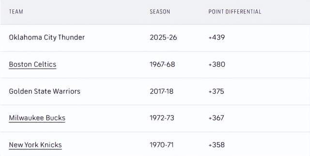 这支雷霆几乎在每个层面都复刻了当年的勇士,这不禁让人发问:勇士的73胜纪录岌岌可危了吗?答案是,千真万确。在我个人看来,若雷霆没能打破这项纪录,那才是令人意外的结果。不过博彩公司却不这么认为。凯撒博彩目前为雷霆开出的胜场超73.5场的赔率为+325,低于73.5场的赔率为-500——这样的赔率设置合情合理,毕竟73胜是一项前无古人的纪录。意外随时可能发生:球员遭遇伤病、密集赛程带来疲惫、爆冷输球在所难免。这些风险我都心知肚明,但我依然认为,若雷霆最终没能拿下74胜,会是一大冷门。要知道,在今日这场大胜之前,雷霆每百回合净胜对手15.9分,这一数据本就足以打破现存的NBA历史纪录,而49分血洗太阳的比赛,更是让这一数据再上一层楼。伤病无疑是最大的未知变数,但不妨试想:雷霆阵中哪位球员伤停,会真正打乱球队的进攻节奏?杰伦-威廉姆斯是球队二号人物,但本赛季他缺阵期间,雷霆照样打出18胜1负的傲人战绩。而那唯一一场失利本不该发生——他们曾手握22分领先优势,最终却被开拓者逆转。别忘了,亚历山大可是本赛季的MVP级球员,而且理论上讲,即便没有他,雷霆也足以摧垮对手。说真的,据CTG数据统计,当亚历山大不在场时,雷霆每百回合仍能净胜对手16.2分——这样的数字,简直令人匪夷所思。