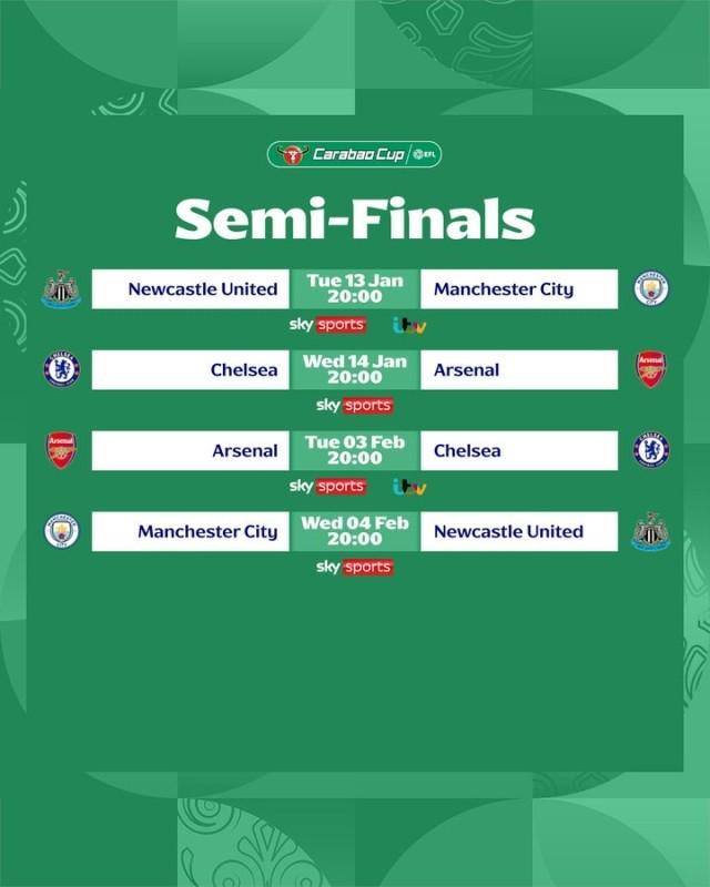 联赛杯半决赛对阵:阿森纳vs切尔西英超 12-24 08:24英格兰联赛杯1/4决赛战罢,半决赛对阵随之出炉。卫冕冠军纽卡斯尔联对阵曼城,首回合1月13日(周二)纽卡主场,次回合2月4日(周三)曼城主场;阿森纳和切尔西则上演伦敦德比,首回合1月14日(周三)切尔西主场,次回合2月3日(周二)阿森纳主场。